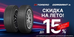 Скидка до 15% при покупке летних шин Cordiant и Torero во всех шинных центрах и в интернет-магазине Шинапоинт. Цены на шины, участвующие в акции, на сайте и в магазинах указаны уже с учетом скидки. Модели и типоразмеры ограничены. Период проведения акции: до 31 октября 2025г.